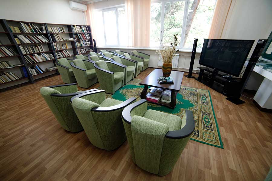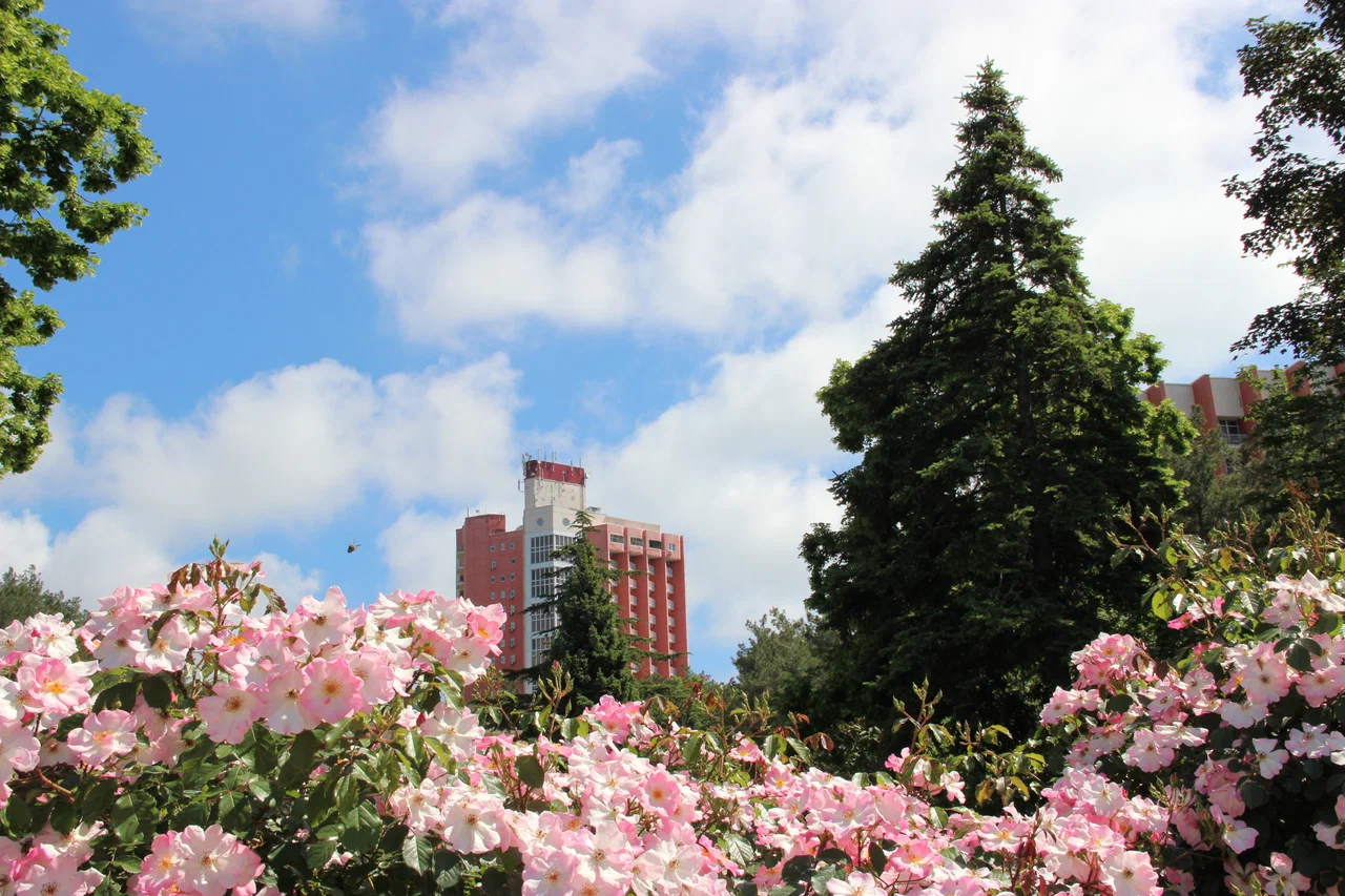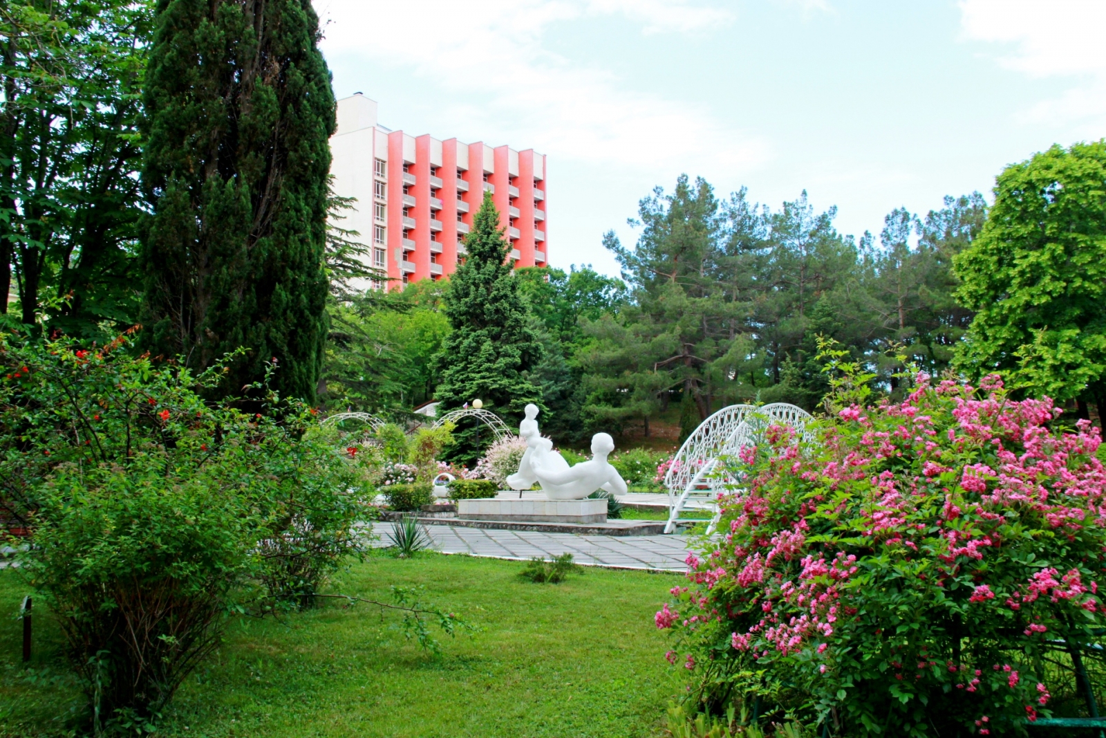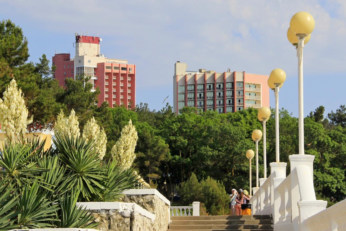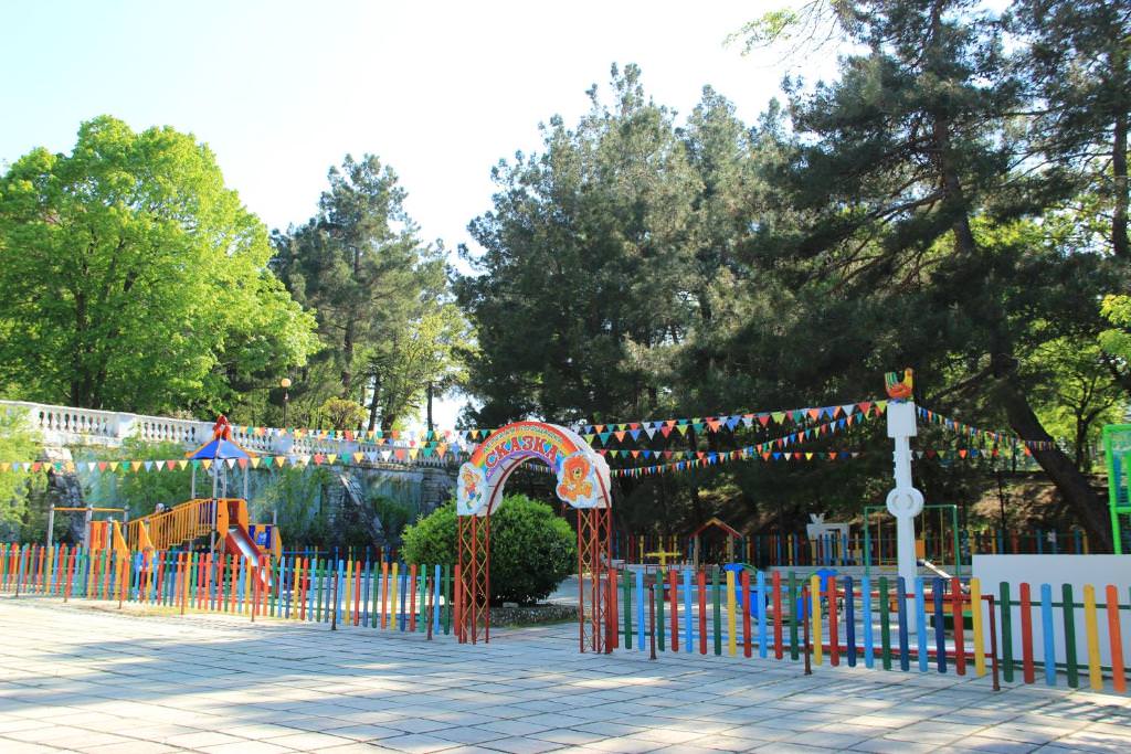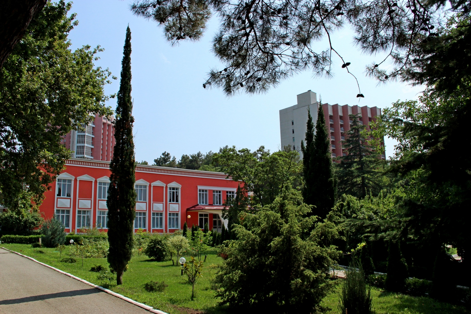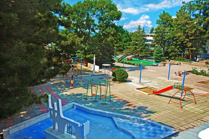 Территория здравницы представляет собой живописный парк площадью порядка 13 гектаров. Розарии и аллеи граничат с лесопарковой зоной, рощей пицундской сосны площадью свыше 800 гектаров и служат прекрасным местом для прогулок и активного отдыха.