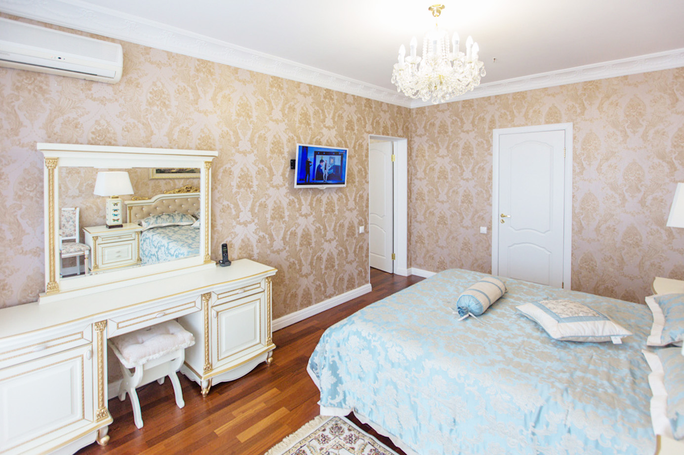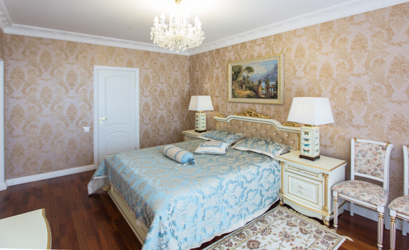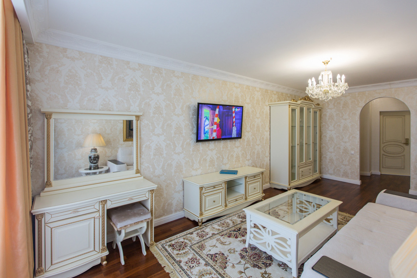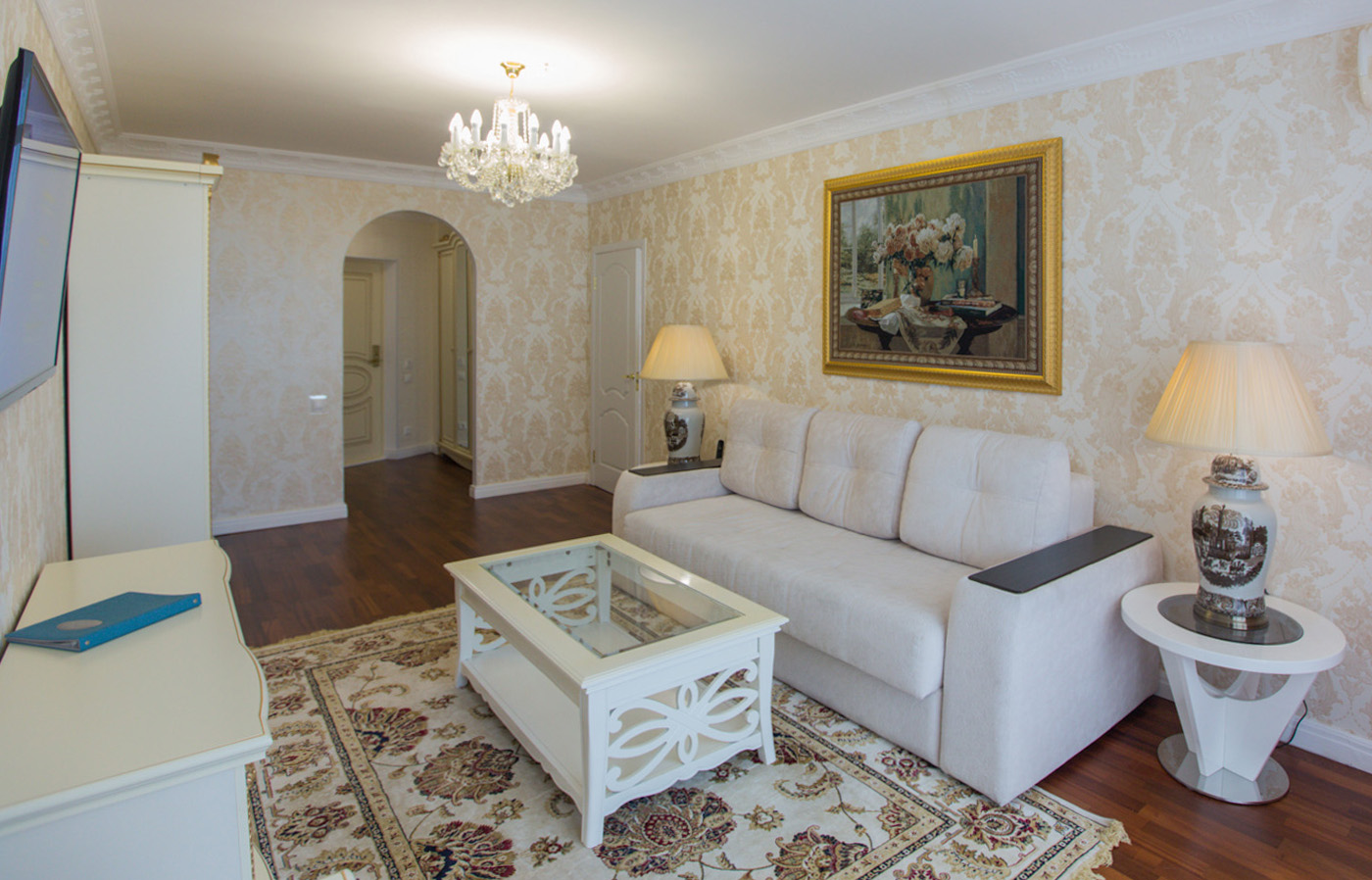 Площадь номера - 45 кв.м. 2 осн. места. 2 доп. места. Балкон. Мебель: вешалка, диван раскладной, зеркало, кровать двуспальная, прикроватные тумбочки, столик журнальный, стул, шкаф, шкаф встроенный. Оборудование: набор посуды, сплит-система (2), телевизор, телефон, холодильник, чайный набор посуды, электрочайник. Санузел: биде, с джакузи, с душевой кабиной, туалетные принадлежности, фен. Сервис: Wi-Fi бесплатно, смена полотенец, смена постельного белья, уборка номера, услуги местной телефонной связи.