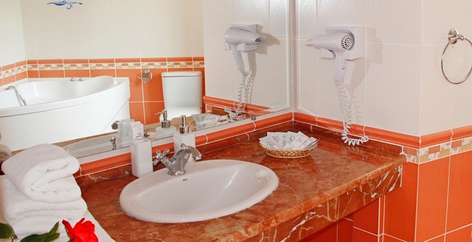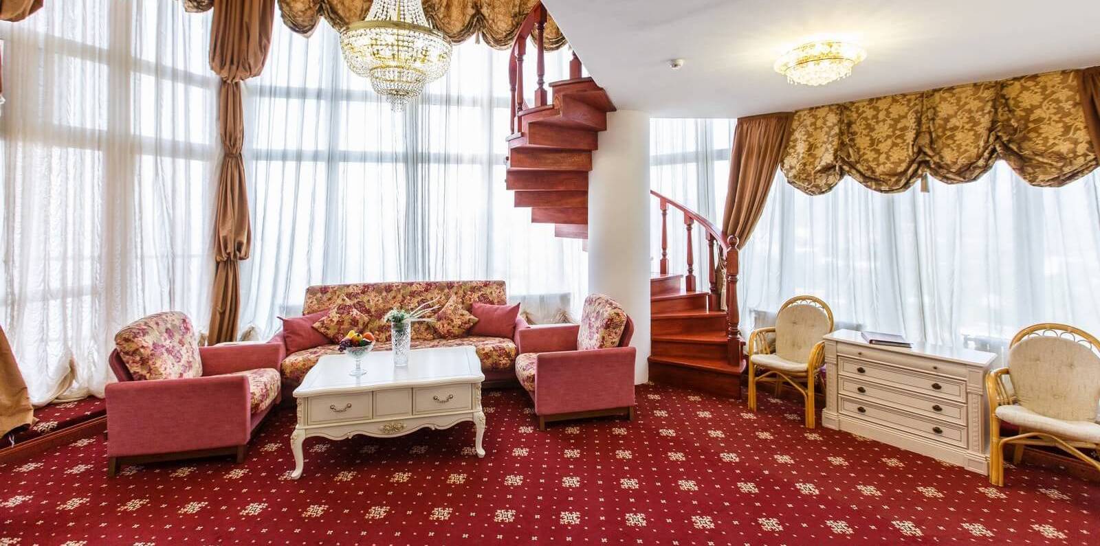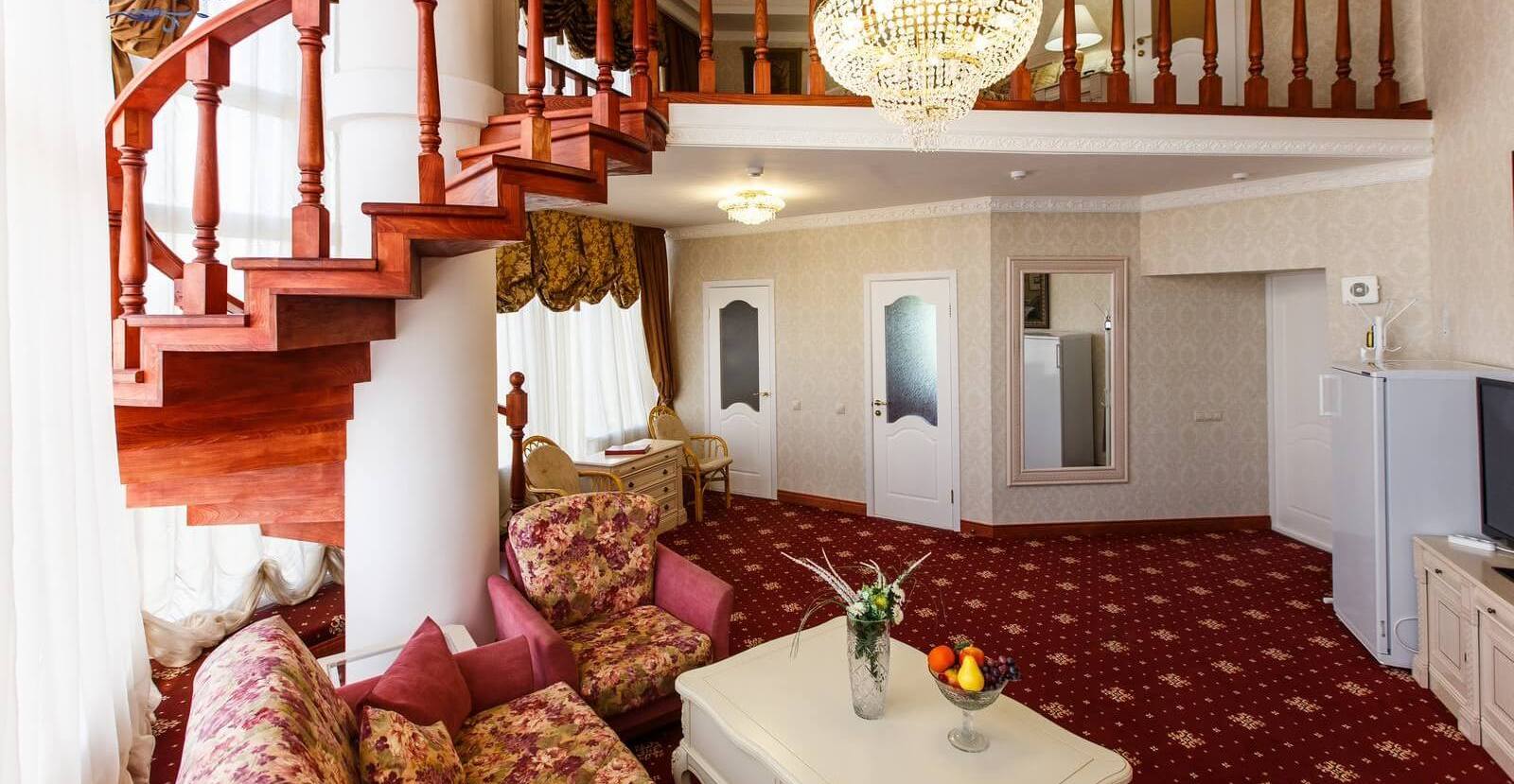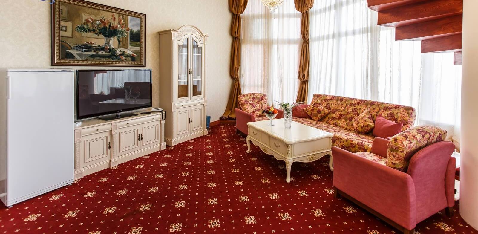 Площадь номера - от 59 кв.м. 2 осн. места. 2 доп. места. Балкон. Мебель: вешалка, диван раскладной, зеркало, кресло (2), кровать двуспальная, прикроватные тумбочки, столик журнальный, стул, шкаф. Оборудование: сплит-система, телевизор ЖК (2), телефон, холодильник, чайный набор посуды, электрочайник. Санузел: с джакузи, с душевой кабиной, тапочки, туалетные принадлежности, фен. Сервис: Wi-Fi бесплатно, смена полотенец, смена постельного белья, уборка номера.